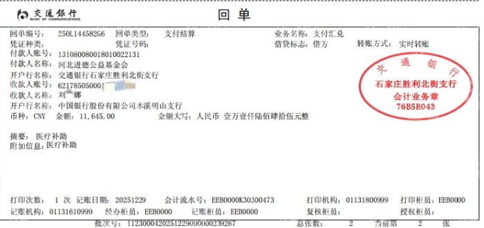 善款支付凭证,收款人为患者母亲 支出:11,645.00元 发布时间:2025-12-30