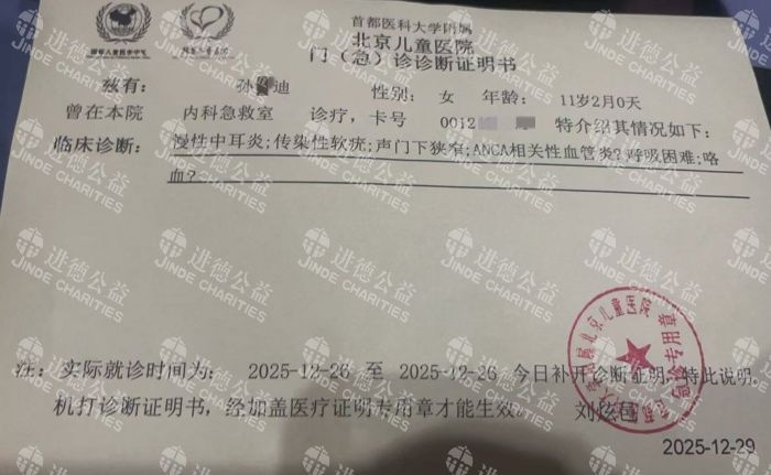 转入北京儿童医院前,孩子开始反复高烧,精神状态持续变差。之后我们先后带他就诊于耳鼻喉科、风湿免疫科,经一系列检查后,确诊多项病症:声门下狭窄、鼻腔出血伴随咯血、听力下降、慢性中耳炎、传染性软疣,最终还确诊了罕见病——ANCA相关性血管炎。