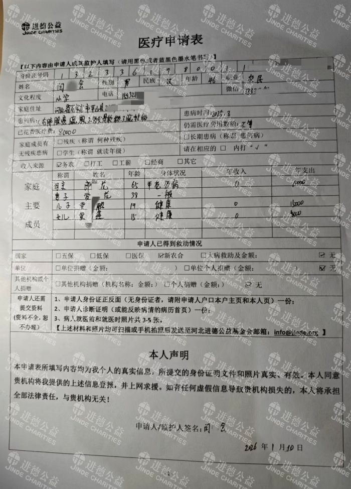 我的家庭早已不堪重负:65岁的母亲常年受腰腿疼痛困扰,只能做些力所能及的家务,完全没有挣钱能力;妻子为了照顾我,辞掉工作寸步不离,家里彻底失去了经济来源;两个孩子还在上学,儿子读高中、女儿读初中,正是需要花钱培养的年纪。不久前,懂事的儿子甚至提出要辍学打工,帮家里分担压力,这句话像针一样扎在我心上。