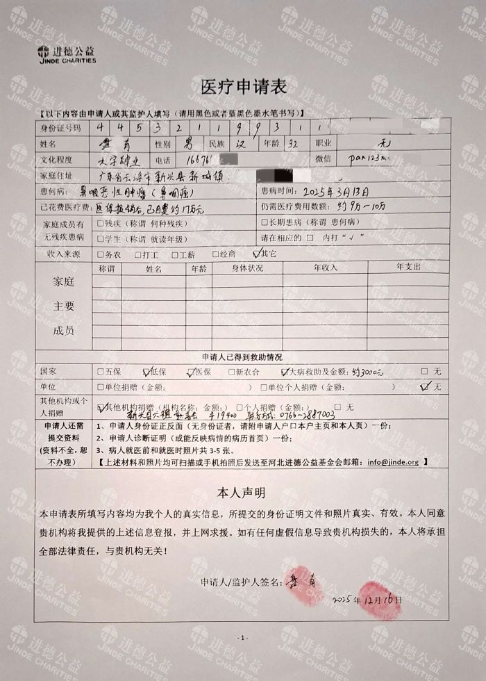 2025年2月28日,我刑满释放不久,便被确诊为鼻咽癌中晚期,并已发生颈部转移。目前,我在广州中山大学孙逸仙纪念医院接受治疗。由于治疗副作用剧烈,我无法工作,没有任何收入,现在是城乡居民最低生活保障对象。