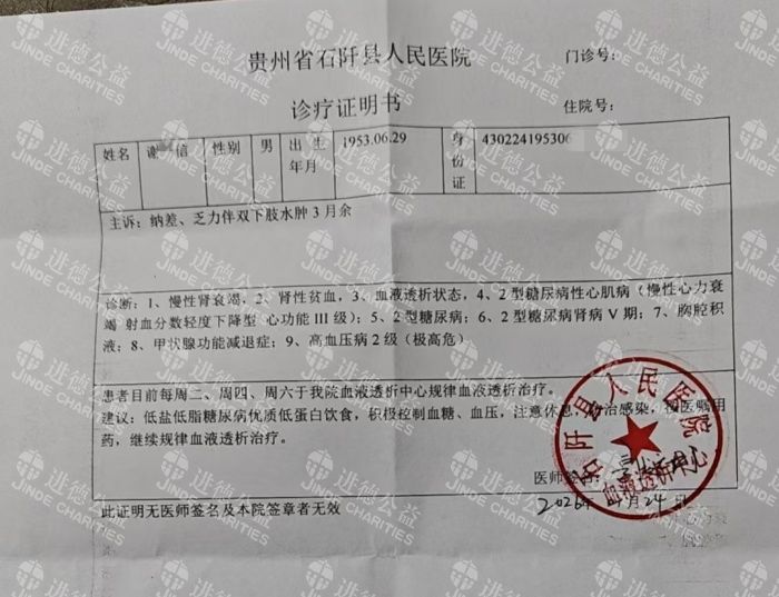 我的公公患有尿毒症,病情已进入需要规律透析维持生命的阶段,目前每两天就要进行一次透析治疗,透析费用成为家庭固定且沉重的开支。婆婆则处于糖尿病晚期,同样需要长期服药、定期复查,身体状况极差,无法从事任何劳动。二老均无收入来源,日常起居与医疗开销都需家人全权承担。
