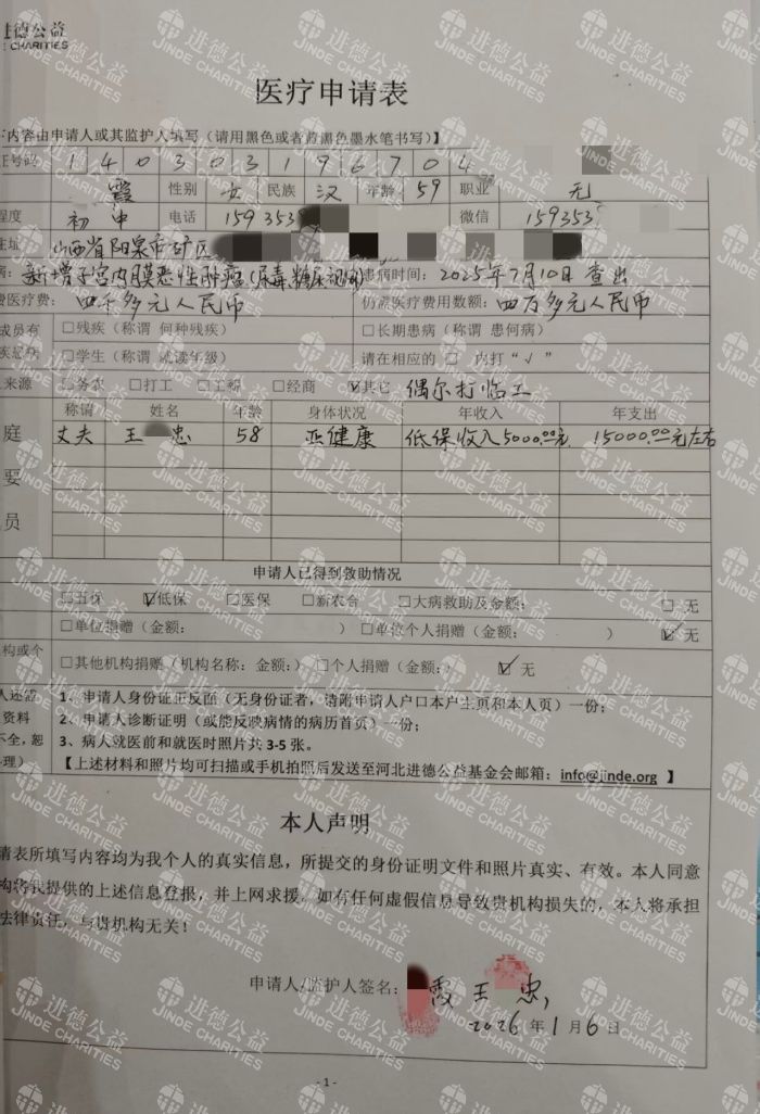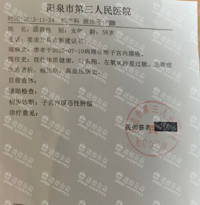 天有不测风云,2025年7月,我又被查出患有子宫内膜恶性肿瘤。为明确病情与治疗方案,我先后经阳泉市第三人民医院、第一人民医院专家会诊,后转至太原肿瘤医院进一步确诊。因我基础病史复杂、并发症较多且病情较重,手术治疗风险极高,医生综合评估后建议采取保守治疗,通过放疗、化疗控制病情进展。而放疗、化疗需预先支付4万元费用方可启动,这笔款项让本就拮据的家庭陷入了绝境。