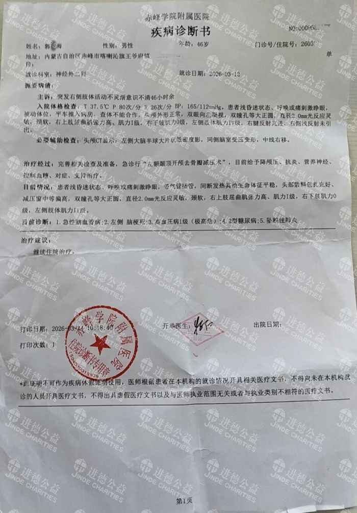 我们来不及多想,立刻开车将他送往医院,住院两天便花费了1万余元。由于病情严重,第三天我们转院至赤峰长城医院,医生为他进行了开颅手术。手术后,他在重症监护室观察了1天,随后转入普通病房。目前,我丈夫已有意识,能够听到外界的声音,但还无法开口说话,仍需进一步治疗。