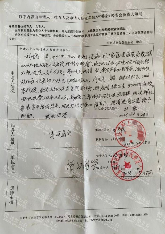 我今年已经65岁,经历了丧子之痛,又身患重病,丈夫也失去了劳动能力,这个家早已不堪重负,我实在走投无路了。在此,我真诚地恳请社会各界的爱心人士,能帮帮我,帮帮我们这个破碎的家庭。哪怕是一笔微薄的捐款、一句温暖的鼓励,都能给我活下去的勇气,给我们这个家庭一丝希望。
