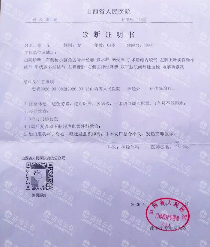 屋漏偏逢连夜雨,2024年起,我自身的身体也出现了严重问题,耳聋、眼疾越来越严重,先后去了几家医院医治,可疗效都不尽如人意。当时因为儿子的治疗已经花光了家里所有的钱,我根本没钱给自己治病,只能硬扛着,任由病情不断恶化。直到2026年,我的病情彻底加重,经山西省人民医院诊断,我患上了脑瘤。