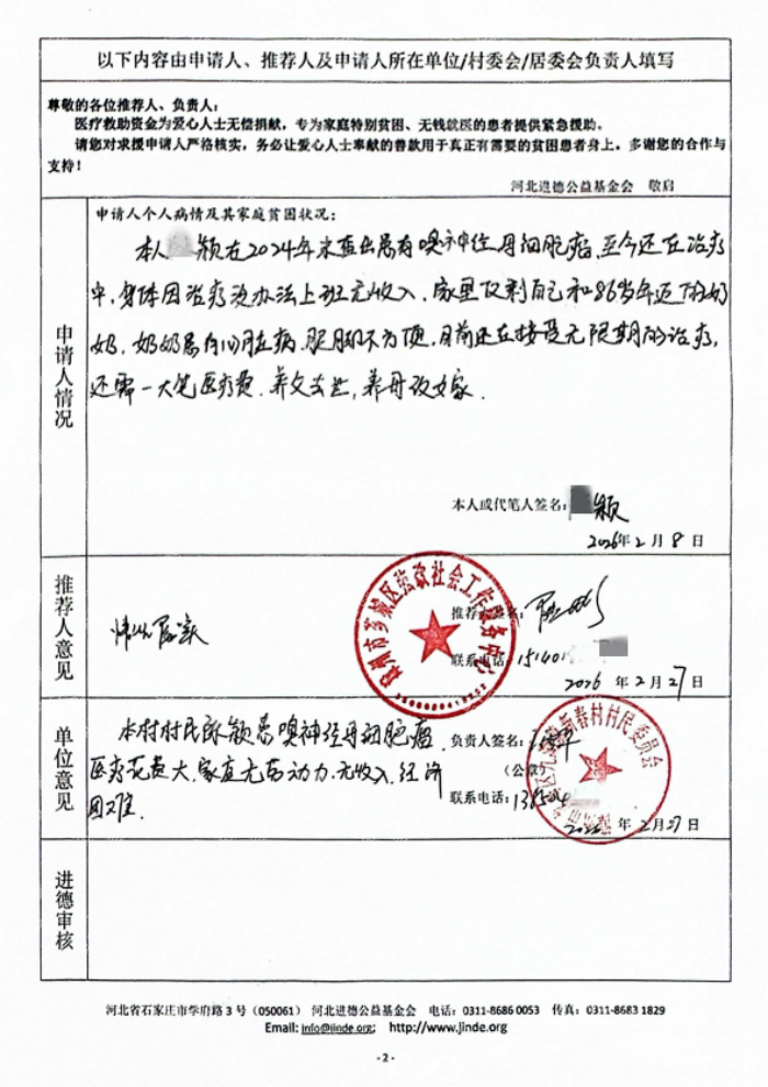 恳请各位好心人能帮帮我,帮我渡过难关,让我能继续治疗,多争取一点活下去的希望,也让我有机会陪伴奶奶走完最后的时光。您的每一份善意、每一笔帮助,对我而言都是活下去的光。我会铭记所有恩情,努力战胜病魔,将来有能力一定回馈社会、帮助他人。