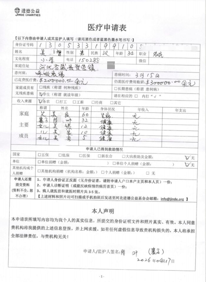 面对巨额的治疗费用,本就拮据的家庭早已无力承担,实在走投无路,恳请社会各界爱心人士伸出援手,帮帮我们这个濒临崩溃的家庭,您的点滴善意,都是我老公活下去的希望,我们全家感激不尽!