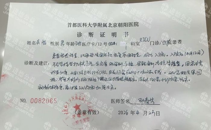 今年3月中旬,我老公开始出现反复发烧、咳嗽不止的症状,我们先后在县、市医院住院治疗,病情非但没有好转,反而持续加重。万般无奈之下,于4月12日紧急转至北京朝阳医院救治。经全面详细检查,我老公被确诊为**重症肺炎、肺部感染**,当即住进重症监护室(ICU),入院当天医院便下达了病危通知书。