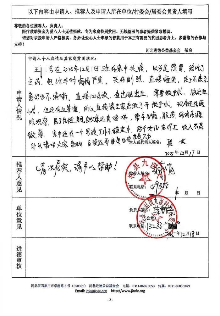 这场突如其来的重病,对于本就拮据的家庭而言,无疑是灭顶之灾。王*芳的丈夫常年患有哮喘,需要长期服药控制病情,早已耗尽了家中的积蓄。家庭经济来源十分微薄,家中的儿子工作不稳定,收入时有时无;两个女儿在外打工,薪资也仅够维持自己的基本生活,根本无力承担巨额的医疗费用。