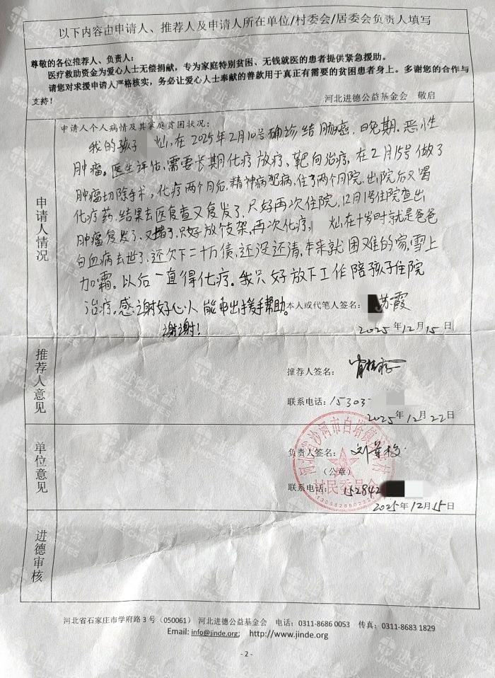 如今,为了陪伴*灿长期治疗,我不得不放下工作,家里彻底失去了经济来源。家中还有两个孩子,老大刚参加工作,收入微薄仅够维持自己的生活;小女儿正在上初中,学业和生活都需要开支。后续的化疗、靶向治疗等费用还在不断增加,早已掏空的家庭再也无力承担。