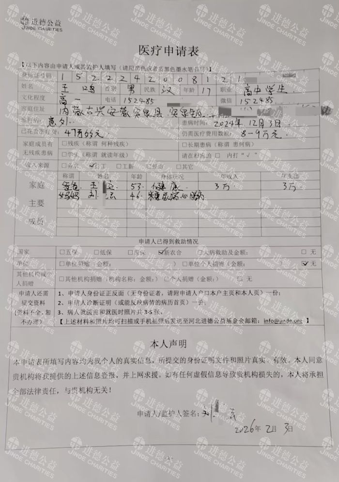 如今我们实在走投无路,万般无奈之下,恳请各位爱心人士伸出援手,帮帮我们这个濒临破碎的家,救救我年仅17岁的孩子,给我们一线活下去的希望。