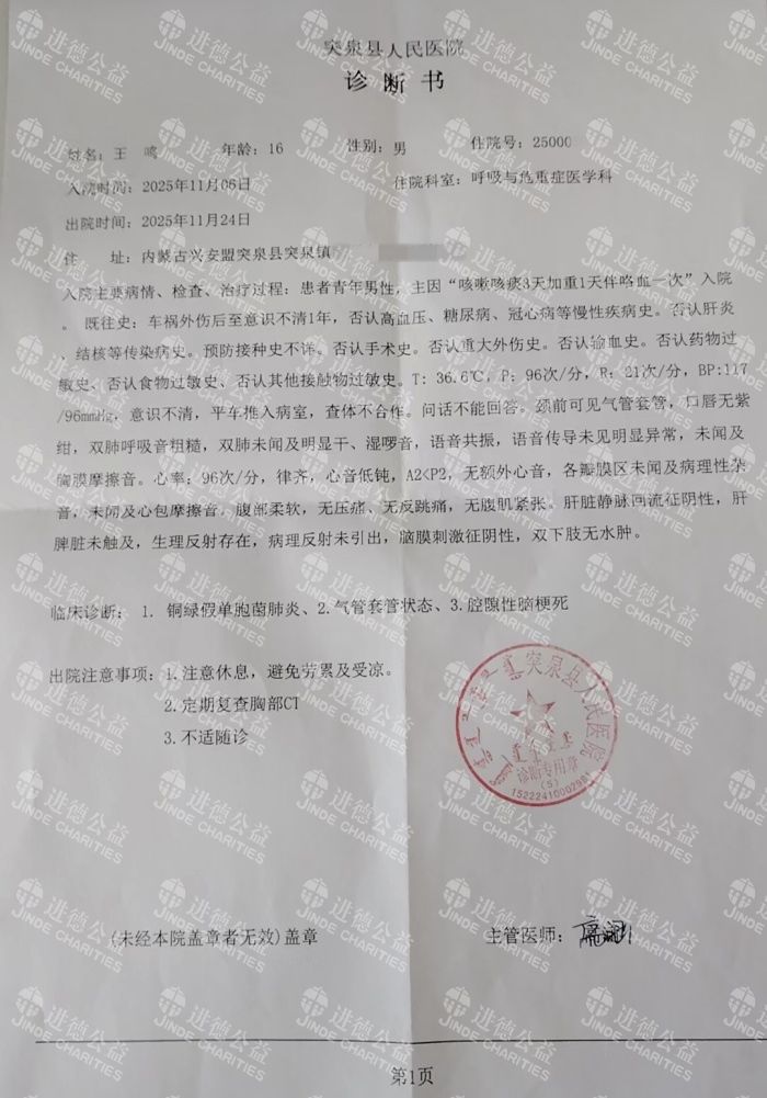 2025年11月6日开始,孩子出现低血压、咳嗽、咳痰甚至咳血的症状,经检查确诊为肺炎、腔隙性脑梗死,至今仍在住院治疗。我和孩子爸爸只能在医院与家中两头奔波,早已没有任何经济来源,生活陷入前所未有的绝境。