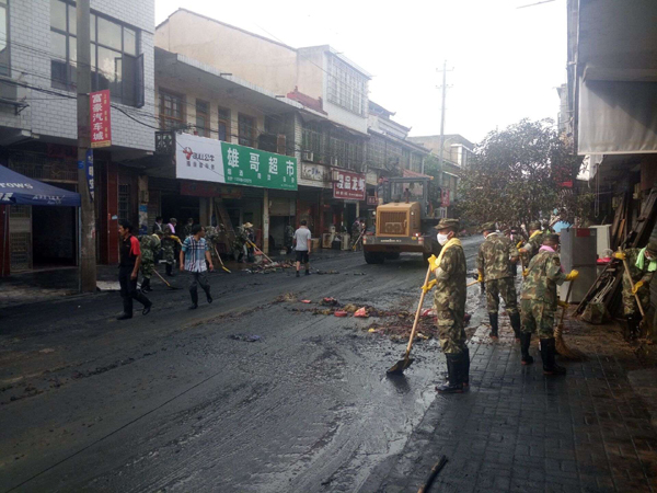 益阳市赫山区泉交河镇,救援官兵正在清理街道废墟,“一下车就闻到一股腥味”。