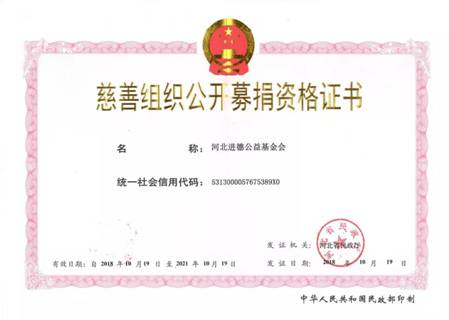 2018年10月31日,进德公益基金会取得河北省民政厅颁发的“慈善组织公开募捐资格证书”,这是我基金会一次里程碑式的收获。