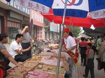 时间:2007-09-18 来源:本站原创2007年9月16日,进德公益防艾办的防艾宣传活动在石家庄赞皇县城展开,活动现场设在万利福超市门口,志愿者身着统一的白色T-恤,头戴小红帽,斜挂鲜红的授带,吸引了很多的行人。