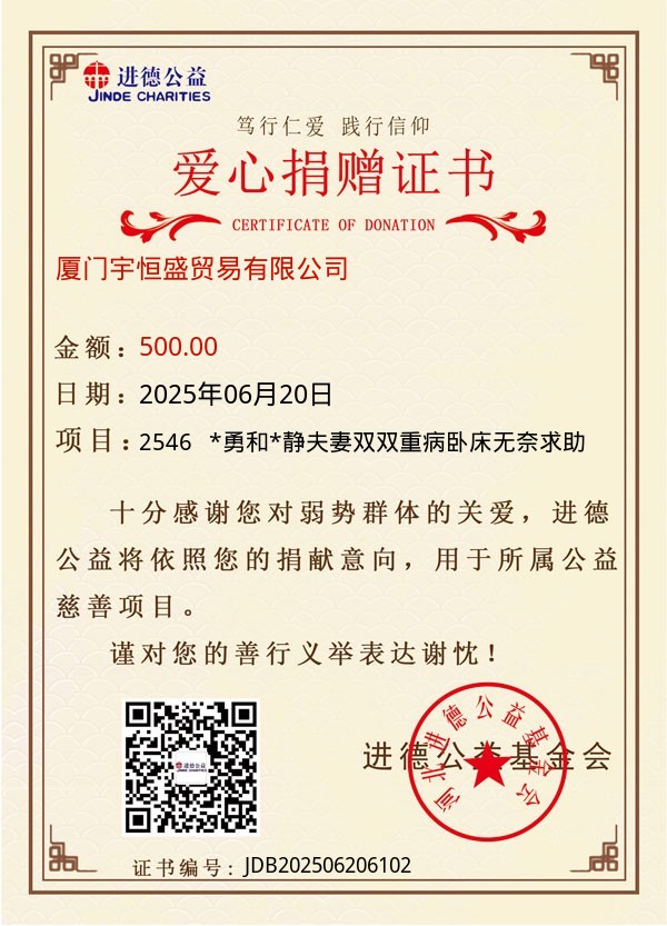 | 厦门宇恒盛贸易有限公司 | 500.00 | 2546 *勇和*静夫妻双双重病卧床无奈求助 | 捐款证书 | 2025-06-20 |