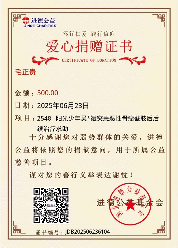 | 毛正贵 | 500.00 | 2548 阳光少年吴*斌突患恶性骨瘤截肢后后续治疗求助 | 捐款证书 | 2025-06-23 |