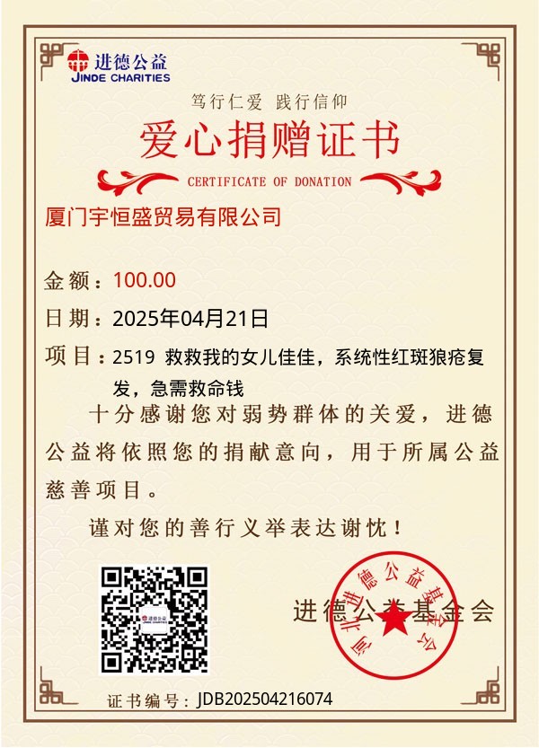 | 厦门宇恒盛贸易有限公司 | 100.00 | 2519 救救我的女儿佳佳,系统性红斑狼疮复发,急需救命钱 | 捐款证书 | 2025-04-21 |