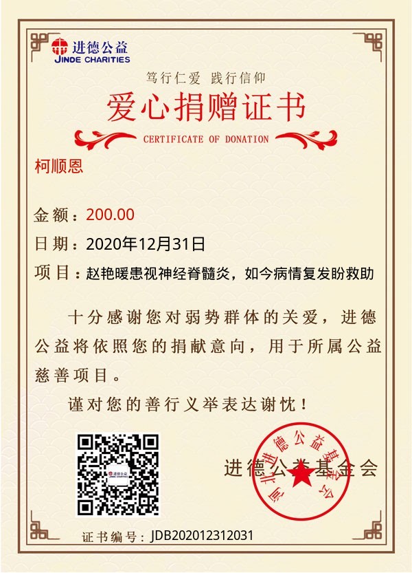 | 柯顺恩 | 200.00 | 赵艳暖患视神经脊髓炎,如今病情复发盼救助 | 捐款证书 | 2020-12-31 |