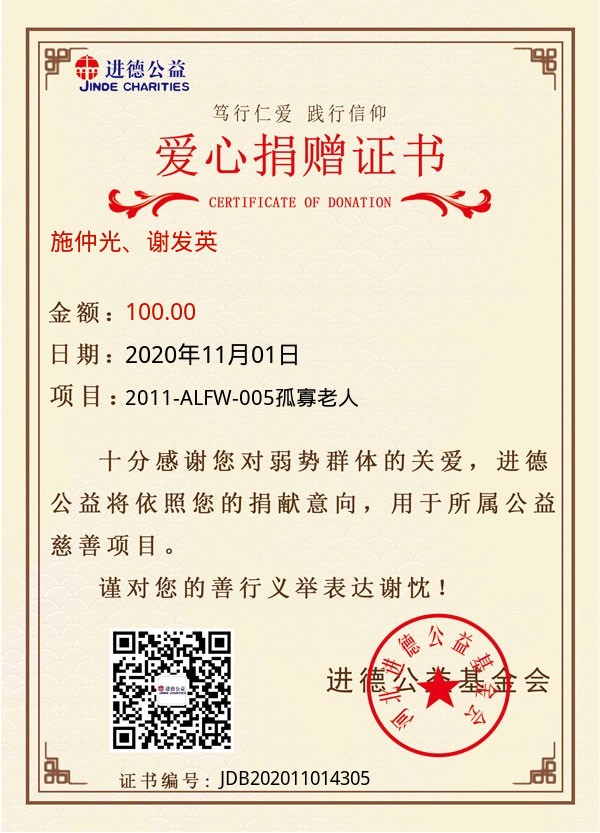 | 施仲光、谢发英 | 100.00 | 2011-ALFW-005孤寡老人 | 捐款证书 | 2020-11-01 |
