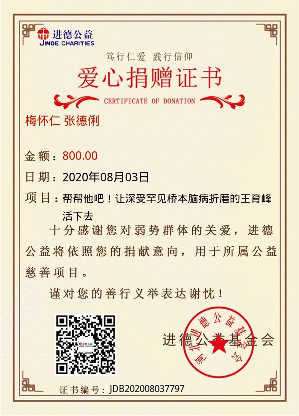 | 梅怀仁 张德俐 | 800.00 | 帮帮他吧!让深受罕见桥本脑病折磨的王育峰活下去 | 捐款证书 | 2020-08-03 |