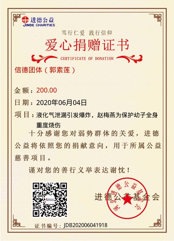 | 信德团体(郭素莲) | 200.00 | 液化气泄漏引发爆炸,赵梅燕为保护幼子全身重度烧伤 | 捐款证书 | 2020-06-04 |