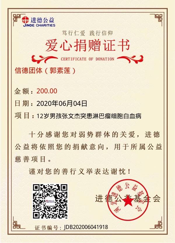 | 信德团体(郭素莲) | 200.00 | 12岁男孩张文杰突患淋巴瘤细胞白血病 | 捐款证书 | 2020-06-04 |