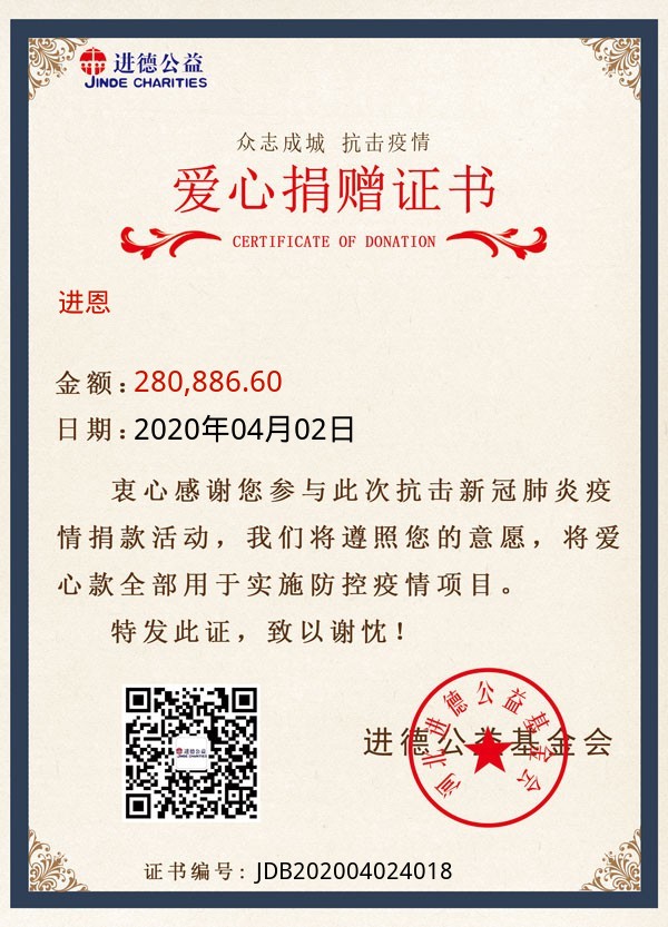 | 进恩 | 280,886.60 | 抗击新冠肺炎:海外援助项目 | 捐款证书 | 2020-04-02 |