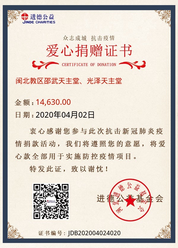 | 闽北教区邵武天主堂、光泽天主堂 | 14,630.00 | 抗击新冠肺炎:海外援助项目 | 捐款证书 | 2020-04-02 |