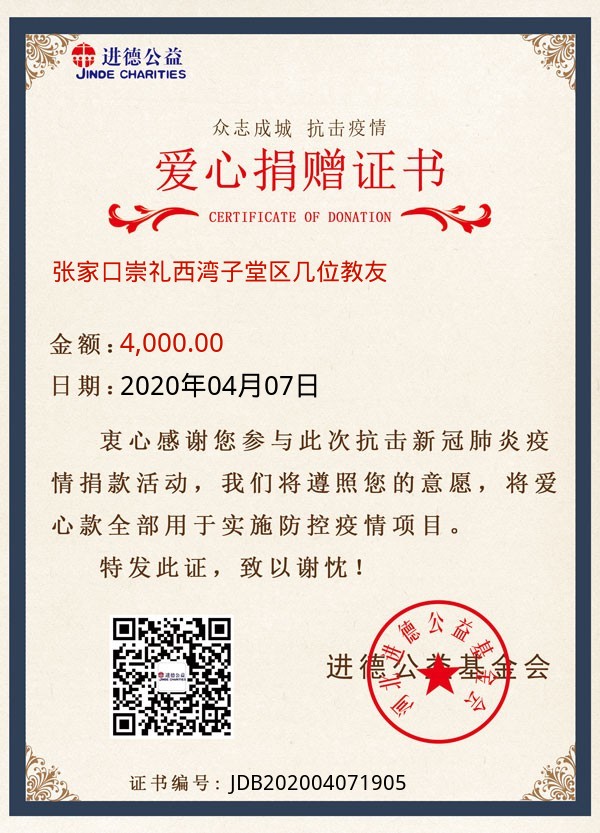 | 张家口崇礼西湾子堂区几位教友 | 4,000.00 | 抗击新冠肺炎:海外援助项目 | 捐款证书 | 2020-04-07 |