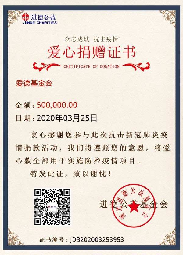 | 爱德基金会 | 500,000.00 | 抗击新冠肺炎:海外援助项目 | 捐款证书 | 2020-03-25 |
