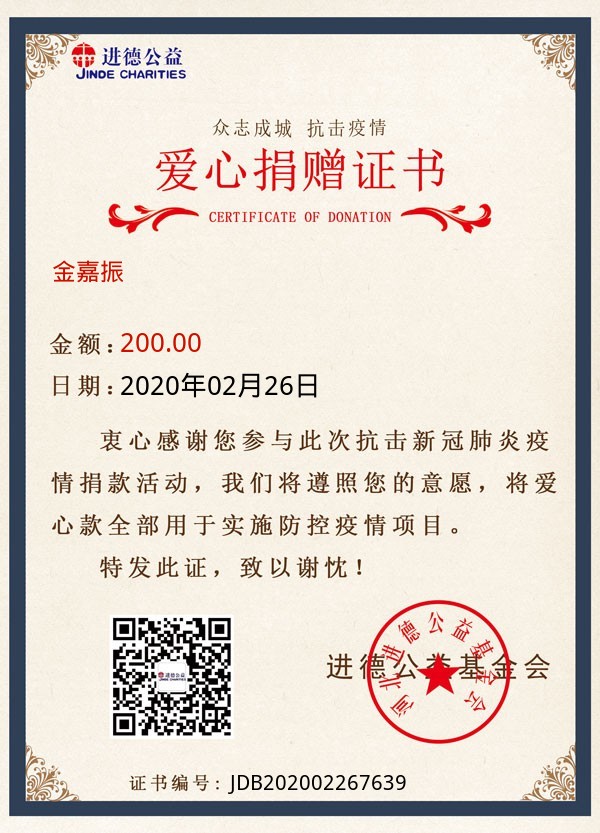 | 金嘉振 | 200.00 | 武汉告急:缺乏防护物资!请求支援! | 捐款证书 | 2020-02-26 |