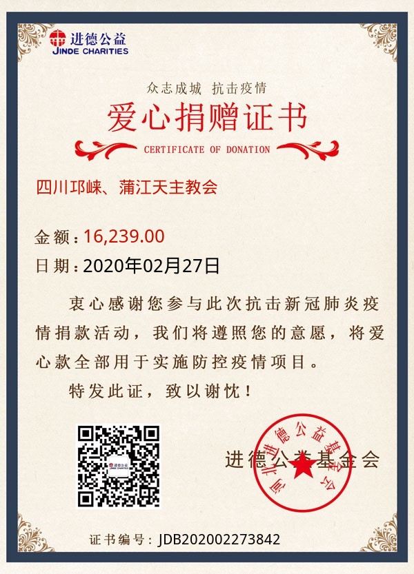 | 四川邛崃、蒲江天主教会 | 16,239.00 | 武汉告急:缺乏防护物资!请求支援! | 捐款证书 | 2020-02-27 |
