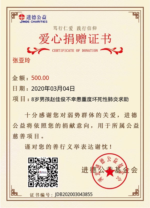 | 张亚玲 | 500.00 | 8岁男孩赵佳俊不幸患重度坏死性肺炎求助 | 捐款证书 | 2020-03-04 |