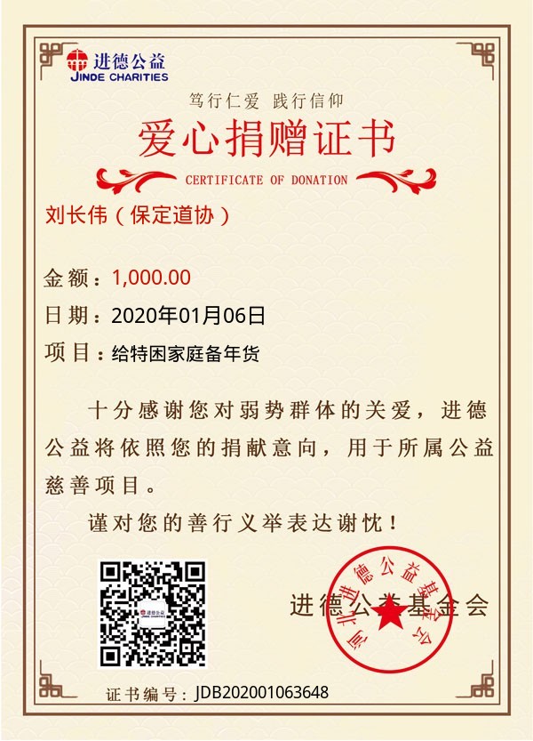 | 刘长伟(保定道协) | 1,000.00 | 给特困家庭备年货 | 捐款证书 | 2020-01-06 |