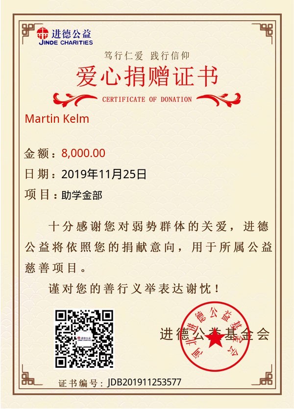 | Martin Kelm | 8,000.00 | 助学金部 | 捐款证书 | 2019-11-25 |