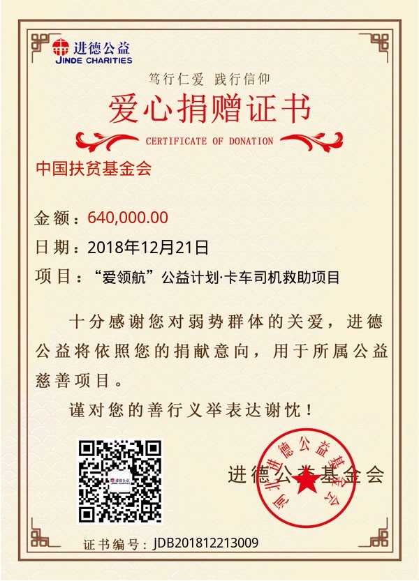 | 中国扶贫基金会 | 640,000.00 | “爱领航”公益计划·卡车司机救助项目 | 捐款证书 | 2018-12-21 |