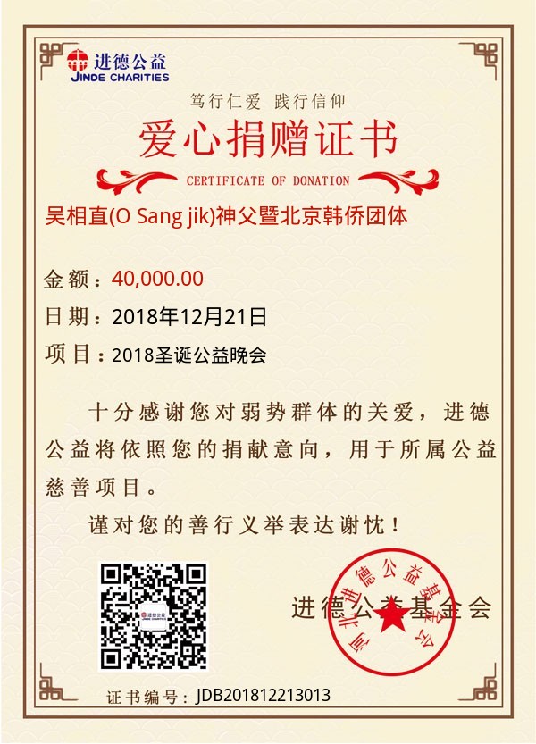 | 吴相直(O Sang jik)神父暨北京韩侨团体 | 40,000.00 | 2018圣诞公益晚会 | 捐款证书 | 2018-12-21 |