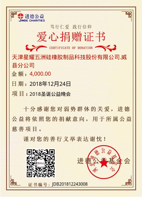 | 天津星耀五洲硅橡胶制品科技股份有限公司.威县分公司 | 4,000.00 | 2018圣诞公益晚会 | 捐款证书 | 2018-12-24 |