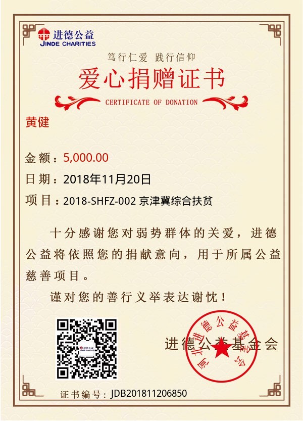 | 黄健 | 5,000.00 | 2018-SHFZ-002 京津冀综合扶贫 | 捐款证书 | 2018-11-20 |