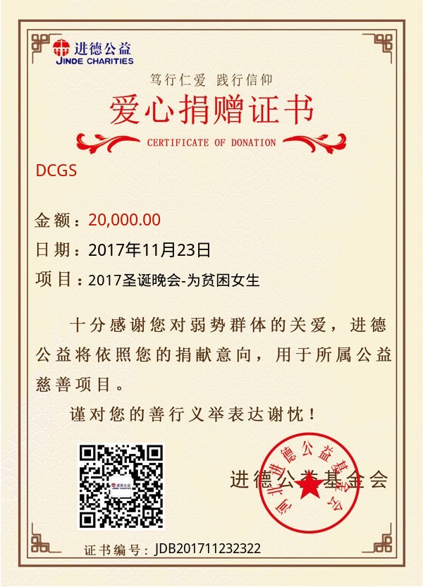 | DCGS | 20,000.00 | 2017圣诞晚会-为贫困女生 | 捐款证书 | 2017-11-23 |