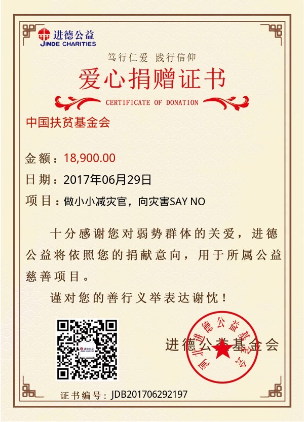 | 中国扶贫基金会 | 18,900.00 | 做小小减灾官,向灾害SAY NO | 捐款证书 | 2017-06-29 |