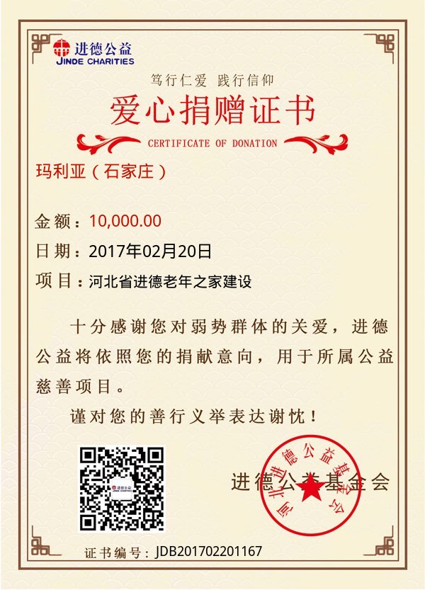 | 玛利亚(石家庄) | 10,000.00 | 河北省进德老年之家建设 | 捐款证书 | 2017-02-20 |