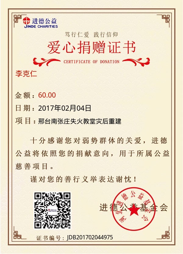| 李克仁 | 60.00 | 邢台南张庄失火教堂灾后重建 | 捐款证书 | 2017-02-04 |