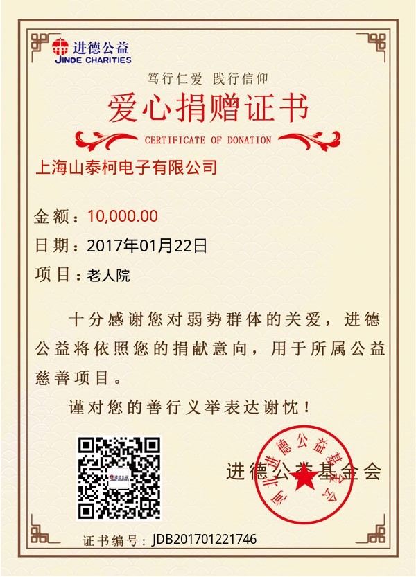 | 上海山泰柯电子有限公司 | 10,000.00 | 老人院 | 捐款证书 | 2017-01-22 |