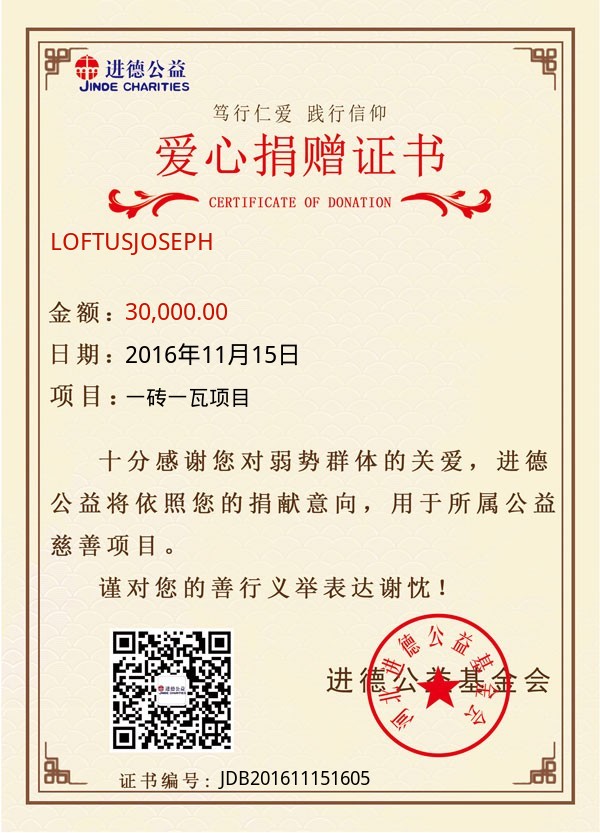 | LOFTUSJOSEPH | 30,000.00 | 一砖一瓦项目 | 捐款证书 | 2016-11-15 |