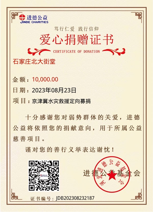 | 石家庄北大街堂 | 10,000.00 | 京津冀水灾救援定向募捐 | 捐款证书 | 2023-08-23 |