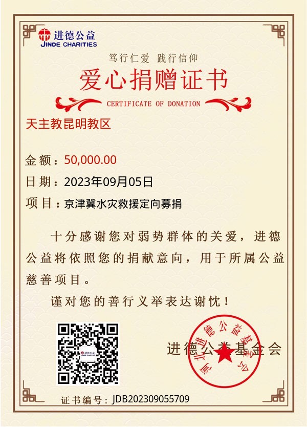 | 天主教昆明教区 | 50,000.00 | 京津冀水灾救援定向募捐 | 捐款证书 | 2023-09-05 |