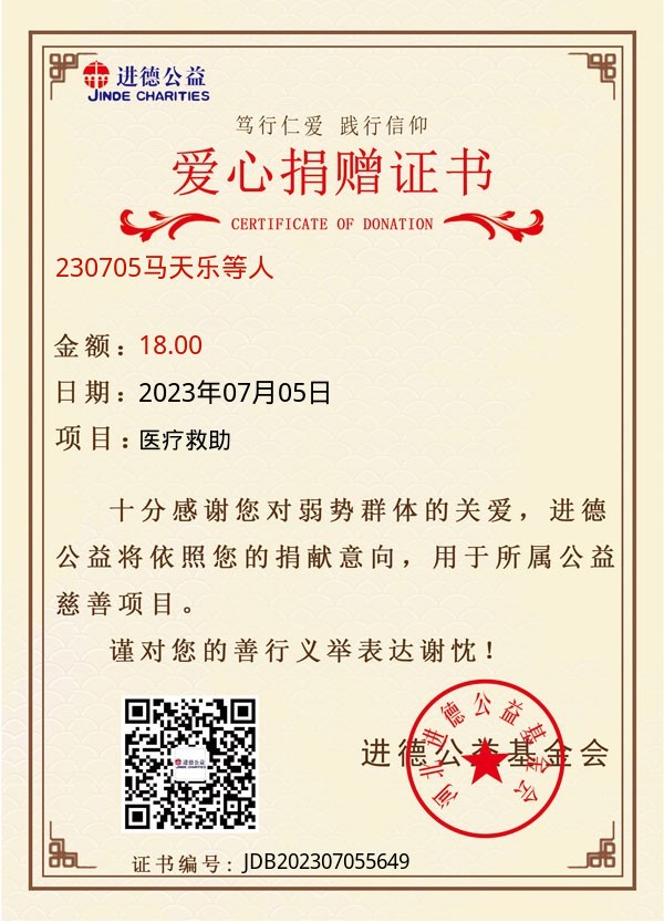 | 230705马天乐等人 | 18.00 | 医疗救助 | 捐款证书 | 2023-07-05 |