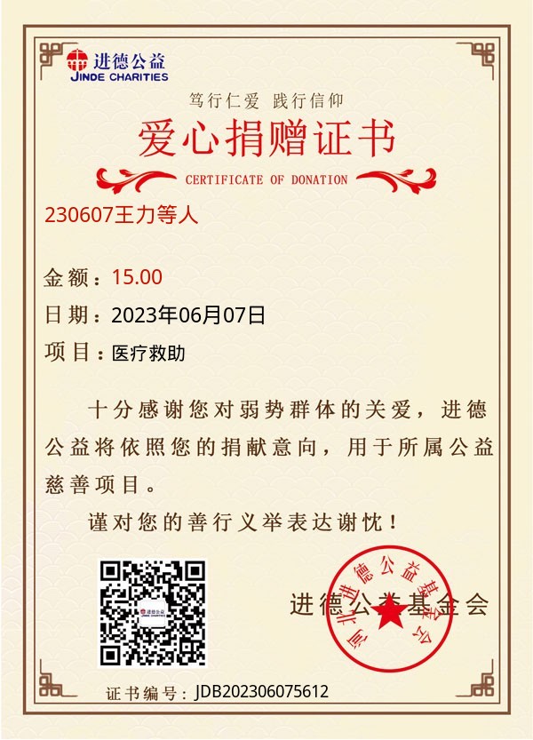| 230607王力等人 | 15.00 | 医疗救助 | 捐款证书 | 2023-06-07 |